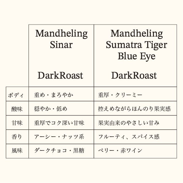 マンデリンならではの力強く深みのある苦味と厚みのあるコクに加え、バターのような滑らかさとバニラのような甘い香りが、濃厚なボディの中にほのかに感じられる満足感の高い味わいです。ミルクとの相性も非常に良く甘味と深みが際立ちます◎